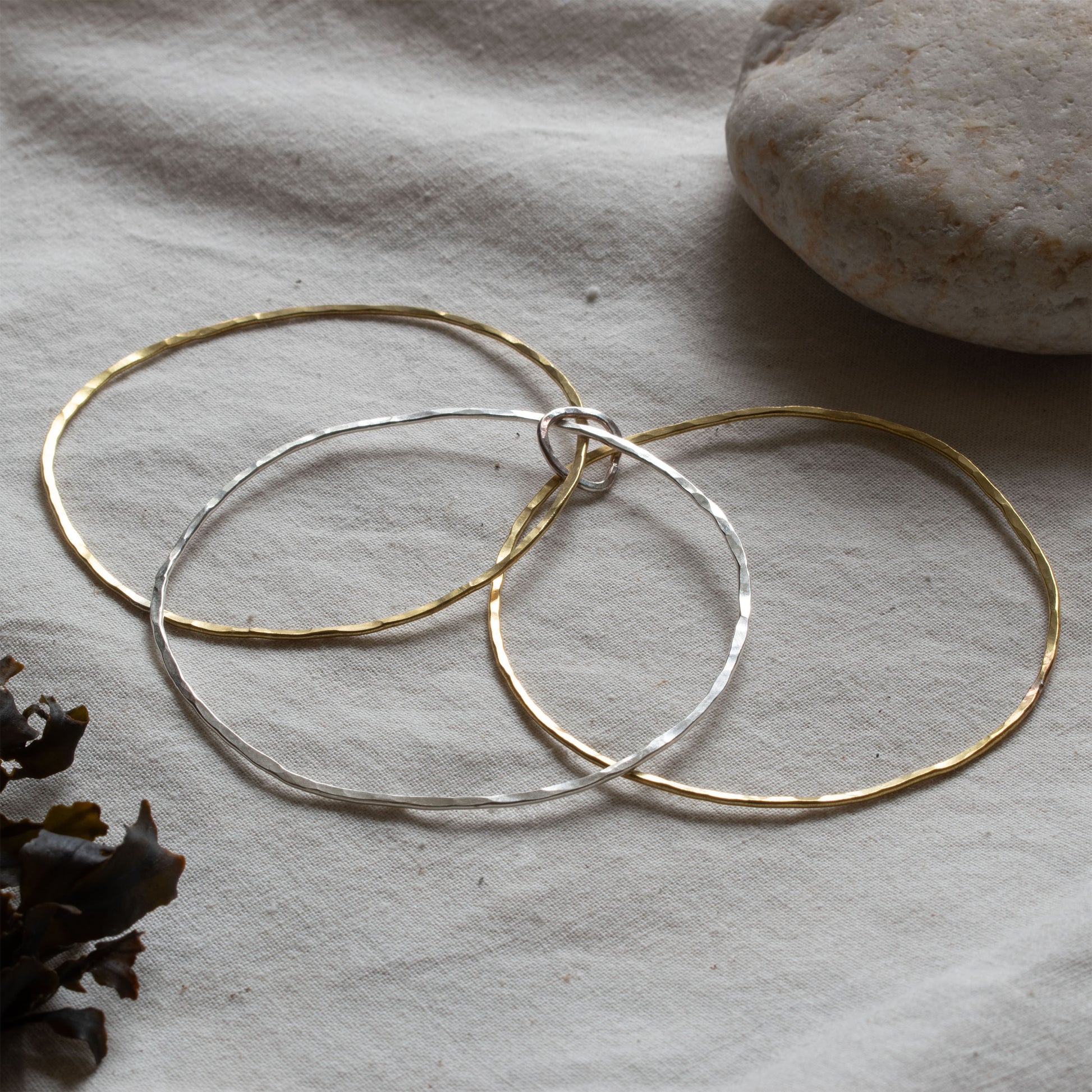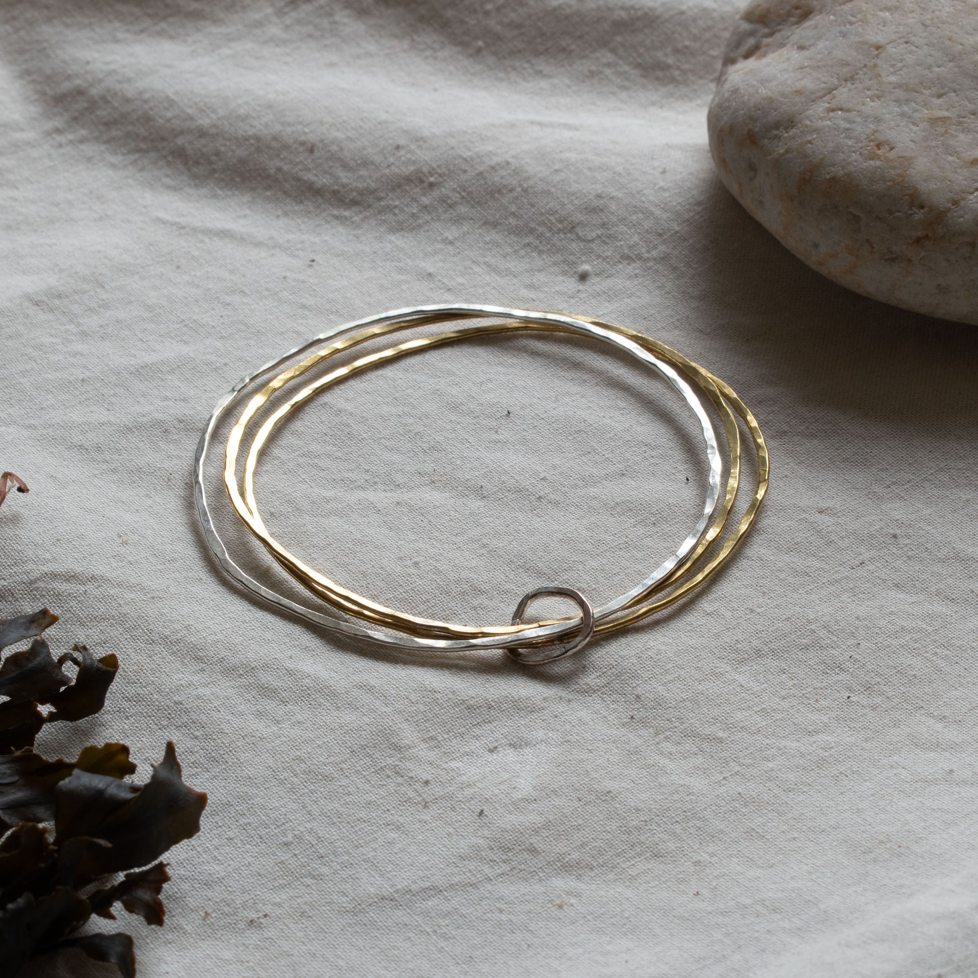It is made up of two hammered brass 1.3mm bangles , one recycled silver 1.3mm bangle joined by a silver pebble shaped loop.