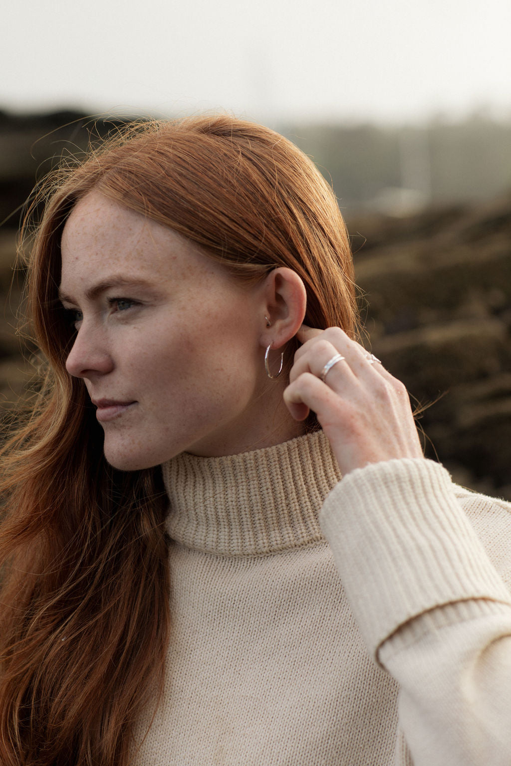 These chunky Durgan Hoops in recycled silver have been hammered by hand in my Falmouth Studio. They are the newest addition to our hoop family and come in two sizes, small and medium.